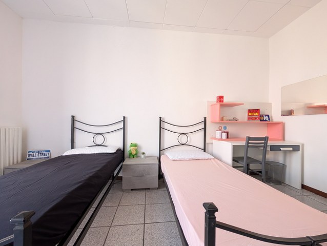 Camera F (Doppia): Ampia e luminosa, con accesso a un terrazzo privato, arredata con due letti singoli, due scrivanie, armadio, cassettiera e comodino.
