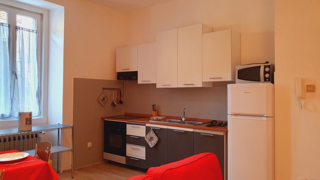 L'immobile, situato al primo piano di una palazzina senza ascensore, si compone da due camere da letto, una singola ed una doppia, luminosa zona soggiorno con angolo cottura attrezzato con i principali elettrodomestici tra cui: frigo, freezer, piano cottura, cappa.