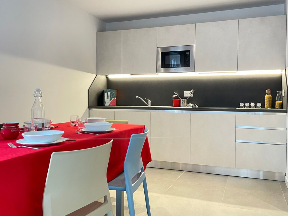 L’immobile, sito al piano rialzato, si compone di cinque stanze, quattro singole ed una doppia, luminosa zona comune arredata con tavolo, sei sedie, angolo cottura attrezzato con i principali elettrodomestici, come: doppio frigo freezer, piano cottura ad induzione, cappa, lavastoviglie, microonde. La cucina è interamente corredata con piatti, bicchieri e tutte le stoviglie necessarie per cucinare i tuoi piatti preferiti.