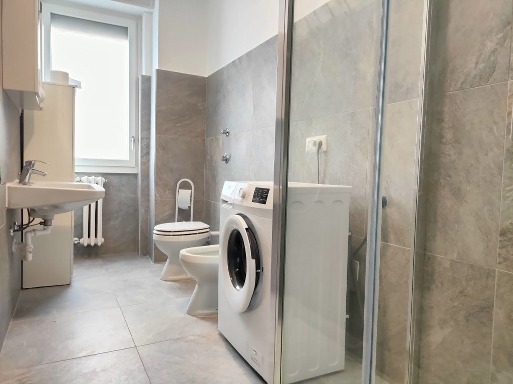 Un bagno principale completo di box doccia e lavatrice e un secondo bagno di servizio, anch’esso con doccia, lavabo e wc, posizionati in punti distinti dell’appartamento per garantire maggiore praticità e una migliore gestione degli spazi.
