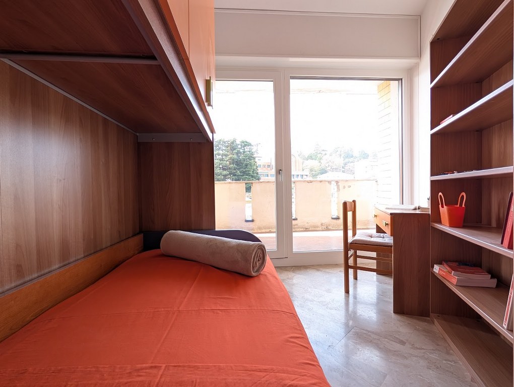 La stanza è arredata con letto singolo, zona studio con scrivania, libreria e armadiatura, offrendo tutto il necessario per organizzare al meglio lo spazio personale. L’accesso diretto al balcone rappresenta un valore aggiunto, ideale per godere di uno sfogo esterno e di una maggiore ariosità.
