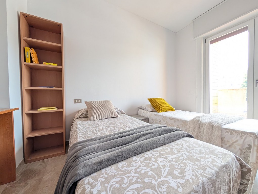 Ampia camera doppia luminosa e ben organizzata, ideale per studenti che cercano comfort e spazi generosi. L’ambiente si distingue per la presenza di due letti singoli e un arredamento completo con grande armadiatura a ponte, scrivanie e libreria, perfetti per garantire funzionalità e praticità nella vita quotidiana.